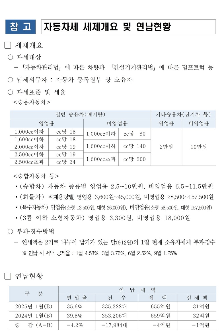 한편, 정부는 당초 자동차세 연납 공제율을 2022년 10%에서 단계적으로 축소해 2025년 이후 3%까지 낮출 계획이었으나, 지난해 말 경기침체로 가계 부담이 커진 것을 고려하여 「지방세법 시행령」을 개정해 공제율 5%를 유지하기로 했다.