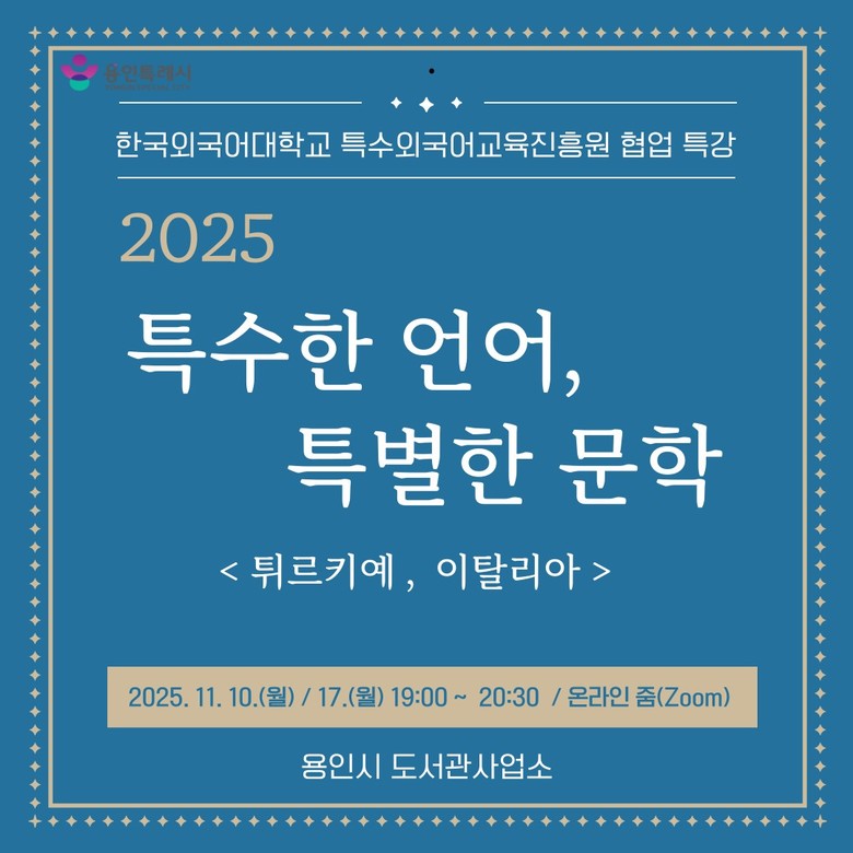 - 튀르키예, 이탈리아 문학으로 만나는 언어와 문화의 향연 - [용인시 세계타임즈=송민수 기자] 용인특례시(시장 이상일)는 11월 10일과 17일 온라인 줌을 통해 시민을 위한 온라인 인문학 강연 ‘특수한 언어, 특별한 문학’을 운영한다고 3일 밝혔다.