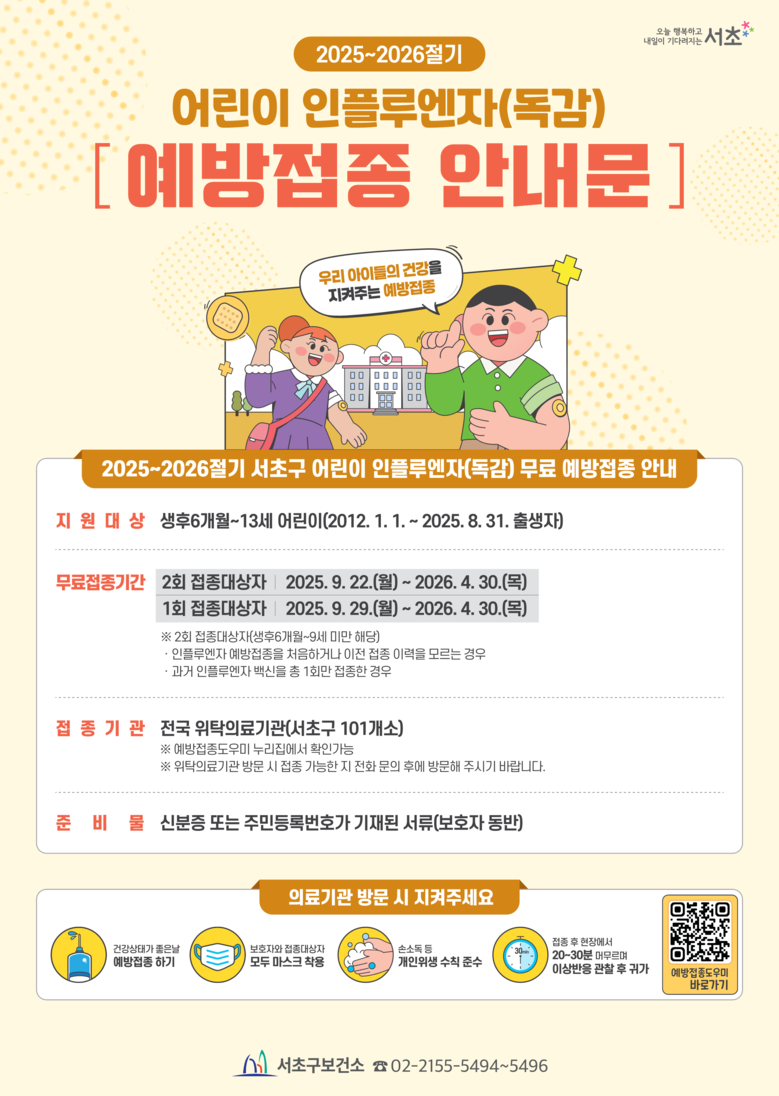 접종기관 방문 시에는 오접종 예방과 안전한 접종을 위해 접종 대상자 본인의 신분증을 지참해야 한다. 어린이는 주민등록등본이나 국민건강보험증으로 본인확인이 가능하고 임신부는 산모 수첩 등으로도 확인할 수 있다. 자세한 사항은 서초구보건소 예방접종사업 콜센터(☎02-2155-5494~5496) 또는 지정의료기관에 문의하면 된다. 인플루엔자 무료 국가예방접종은 주소지 관계없이 가까운 위탁의료기관에서 가능하고 해당 기관은 예방접종도우미 누리집(https://nip.cdc.go.kr) 예방접종관리 탭에서 확인할 수 있다.