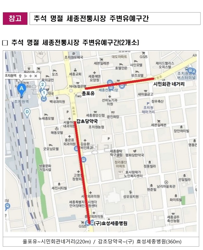 단속유예구간은 올포유 매장에서 시민회관 네거리까지 220m, 감초당 약국에서 옛 효성세종병원까지 360m이다.
