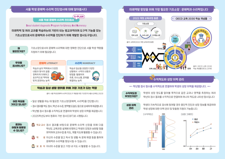 서울 학생 문해력·수리력 진단검사(에스플랜, S-PLAN)는 미래학력 및 여러 교과를 학습하는 데 기반이 되는 범교과적이며 도구적 기능을 갖는 기초소양으로서의 문해력과 수리력을 진단하는 검사이다