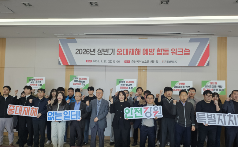 [강원도 세계타임즈=김민석 기자] 강원특별자치도는 3월 27일(금) 오후 1시 춘천 베어스호텔에서 도·시군, 고용노동부 등 관계자 50여 명이 참석한 가운데 ‘2026년 상반기 중대재해 예방 합동 워크숍’을 개최했다. 이번 워크숍은 중대재해처벌법 엄정 대응 기조에 맞춰 실질적인 사고 예방과 현장 실무자의 대응 역량 강화를 위해 마련됐다.