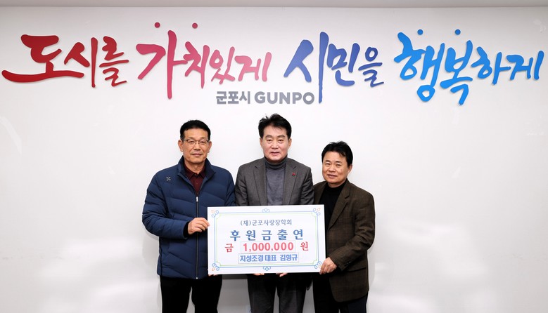 한편, 12월 29일(월)에는 군포시청 시장실에서 지성조경 김형규 대표가 장학금 1백만원을 기탁하며 ”미래를 향해 성실히 나아가는 학생들을 응원하는 마음으로 조금이나마 보탬이 되고자 장학금을 기탁하게 되었다. 학생들이 스스로의 가능성을 믿고 꿈을 향해 나아가길 바란다”고 말했다.