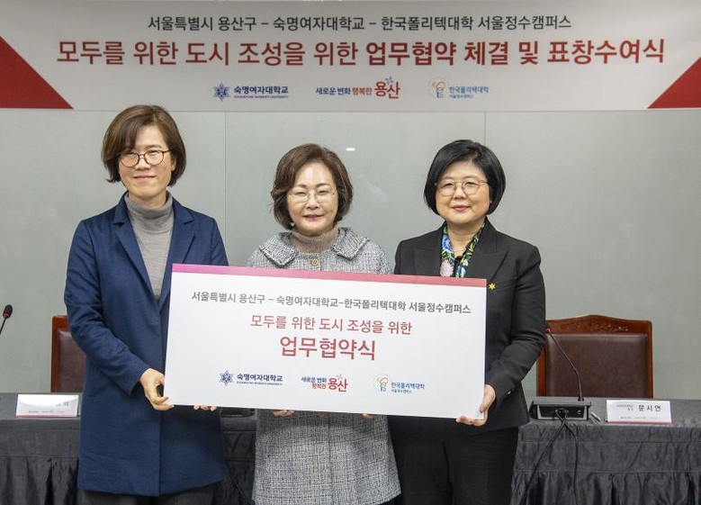 박희영 용산구청장은 “범용 공공디자인으로 살기 좋은 용산을 만드는 데 뜻을 모아주신 숙명여대와 한국폴리텍대학 서울정수캠퍼스에 감사드린다”라며 “구와 2곳 학교는 협력을 통해 도시디자인 분야에서 교류하고 상호 발전을 도모해 가겠다”라고 밝혔다.