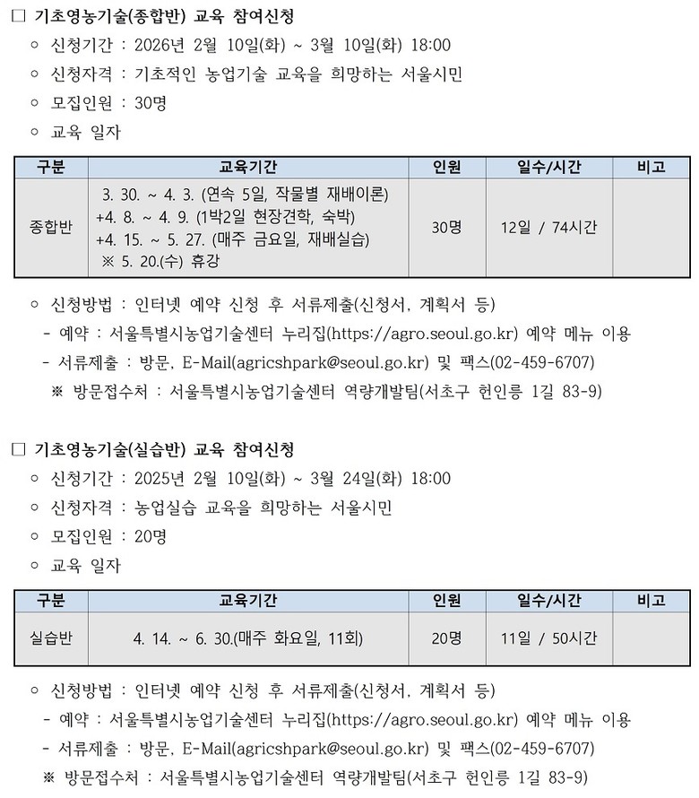 기초영농기술교육 (종합반) | 3월 30일~5월 27일(30명) (비연속 12회) | 2월 10일~3월 10일 ※인터넷 예약 및 서류 제출 |