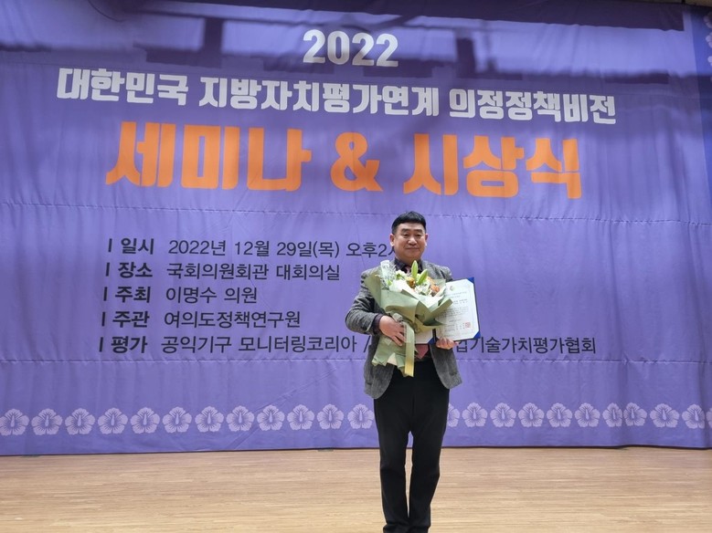[부산 세계타임즈=이용우 기자] 부산시의회 강달수 의원(사하구2, 국민의힘)이 여의도정책연구원이 주관하는 “2022 대한민국 지방자치평가연계 의정정책비전대상“에서 대상을 수상하는 영예를 안았다. 지난 29일(금) 국회의원회관 대회의실에서 열린 이번 시상식은 전국 지방자치의회 의원들의 지방자치 활성화를 위한 주민행복 정책 및 지역 활동 기여도 등을 공정하고 객관적인 통계심사를 기반으로 의정대상 수상자를 선정한다. 특히나 이번 수상은 부산자치단체의원 중에서 유일한 수상자로 선정되어 그 의미가 더 크다.
