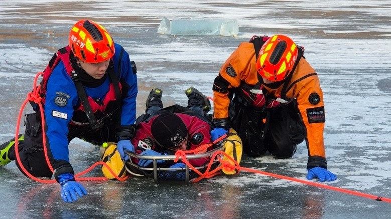 훈련은 동력 절단 장비를 활용한 얼음 절단, 얼음 밑 수중 수색, 지상–수중 간 통신을 활용한 합동 구조 전술 등으로 구성해 극한환경 속 수난사고 대응 능력을 점검하고 실전 전술을 숙달할 수 있도록 했다.