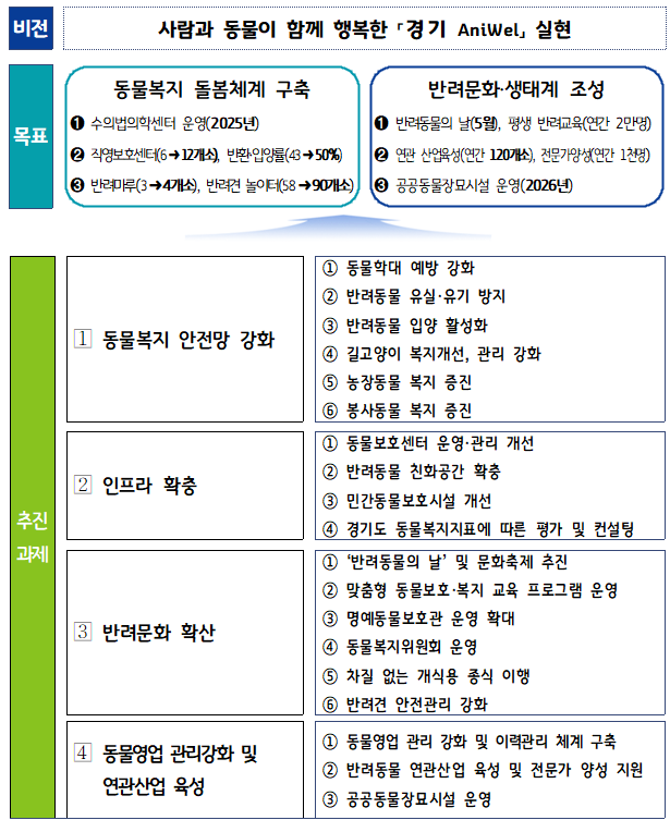 이번 계획은 ▲동물복지 안전망 강화 ▲인프라 확충 ▲반려문화 확산 ▲영업 관리 및 연관산업 육성 등 4개 분야를 중점적으로 추진한다.