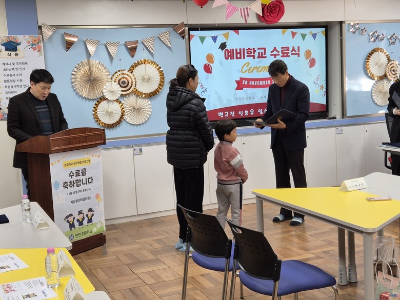 [부산 세계타임즈=이용우 기자] 부산 동래구 안민초등학교(교장 문부환)는 지난 28일 오후 3시 안민초등학교에서 학생과 학부모, 통합학급 교사 등 30여 명이 참석한 가운데 ‘초등학교 입학 전 학교적응 프로그램’ 수료식을 가졌다.