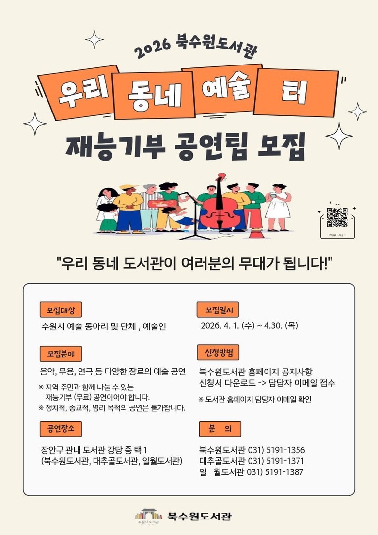 선정된 공연팀은 5월부터 12월까지 북수원·대추골·일월도서관 강당 등에서 공연할 수 있으며, 도서관은 공연 공간을 제공한다.