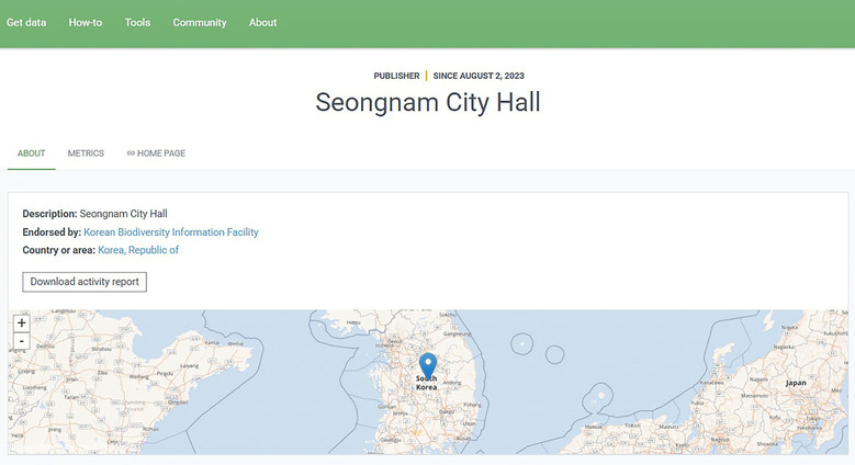 | ▲ 세계생물다양성정보기구(GBIF·지비아이에프) 플랫폼 성남시 화면 |