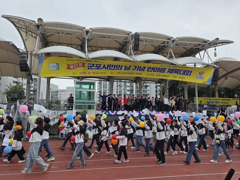 [군포시 세계타임즈=송민수 기자] 군포시와 군포시체육회가 주최·주관한 ‘제37회 군포시민의 날 기념 한마음체육대회’가 10월 18일 군포 시민체육광장에서 성황리에 개최됐다. 이번 대회는 관내 12개 동 주민들이 참가하여 세대와 지역을 아우르는 화합과 소통의 장을 이루었다.