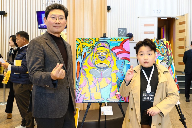 ▲ 이상일 용인특례시장은 2일 사단법인 용인문화시민광장 4주년 기념 연주회에 참석해 장애아동화가 박준서 작품을 관람했다