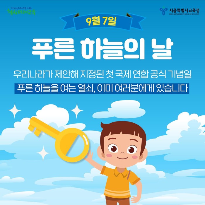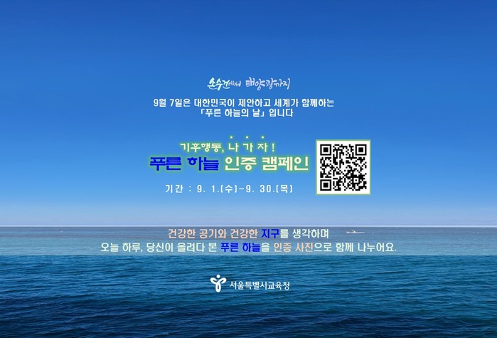 서울시교육청은 지난 4월과 6월에 진행된 ‘기후행동, 나가자!*’ 선언과 실천 인증에 이어 9월 한 달간 2021년 제2회 푸른 하늘의 날 주제인 「건강한 공기, 건강한 지구」를 반영하여 ‘오늘 당신의 푸른 하늘을 함께 공유해요!’ 캠페인 활동도 함께 진행한다. 건강한 공기, 건강한 지구를 생각하며 오늘 하루, 당신이 올려다본 푸른 하늘을 인증 사진으로 함께 나누는 이 행사를 통해 지구 대기 환경과 기후 변화에 대한 학교, 학생, 학부모·시민들의 이해와 관심을 높이고 지속 가능한 지구 환경과 삶을 위한 서울교육공동체의 기후위기 대응을 실천함으로써 삶의 양식 전환을 도모할 예정이다.