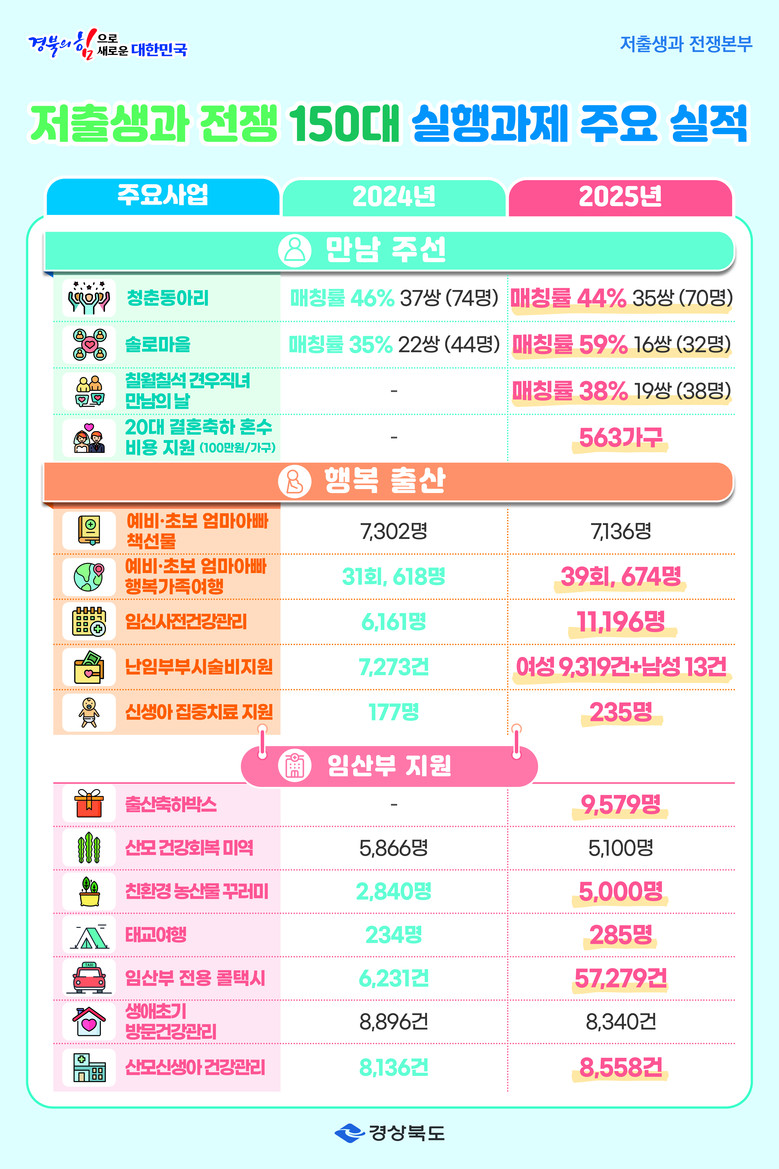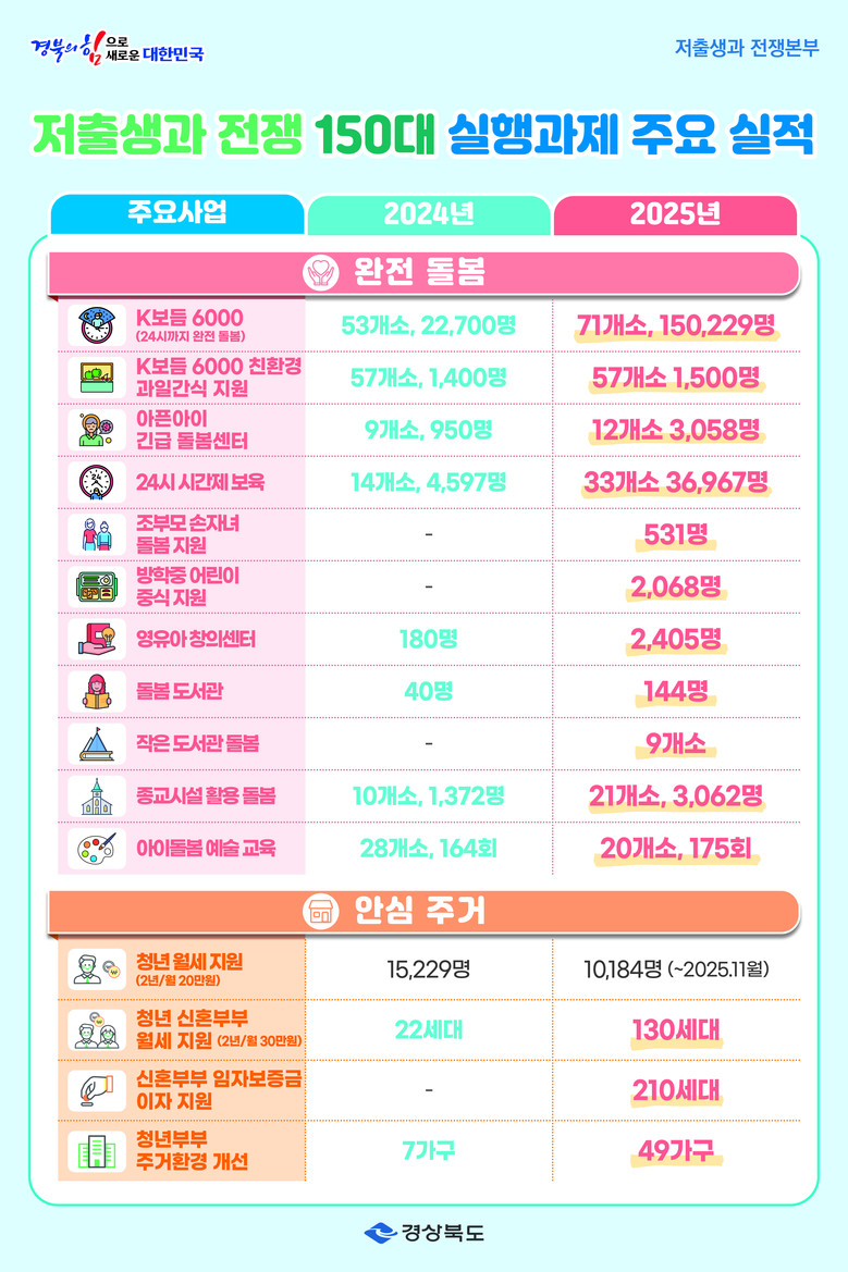 경북도는 2025년에 이어 2026년에는 선택과 집중 전략으로 정책의 완성도를 한 단계 끌어올린다는 방침이다. 체감 효과 중심으로 저출생 과제를 압축·결합해 기존 150대 과제를 120대 과제로 재편하고, 전년 대비 400억 원 증가한 총 4,000억 원 규모의 저출생 대응 예산을 투입할 계획이다.