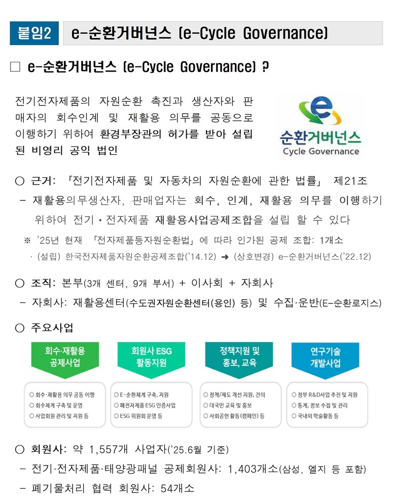 한편 경기도는 2024년 5월 3일 e-순환거버넌스(구 한국전자제품자원순환공제조합)와 협약을 체결하고, 수원 등 19개 시군을 대상으로 중소형 폐가전제품의 무상 배출, 정기 수거체계 구축을 합의 한 바 있다.