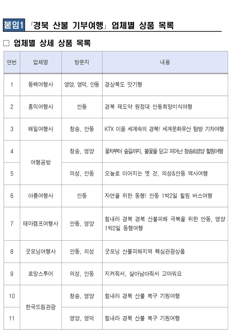 경북도는 이와 함께 10개 전담여행사를 통해 기부와 관광을 결합한 ‘기부 여행’ 상품도 선보인다. 관광객이 산불 피해지역 핵심 관광콘텐츠를 엮은 테마여행에 참여하면, 참가 인원당 피해지역 복구를 위한 기부금 1만원이 자동 적립된다.