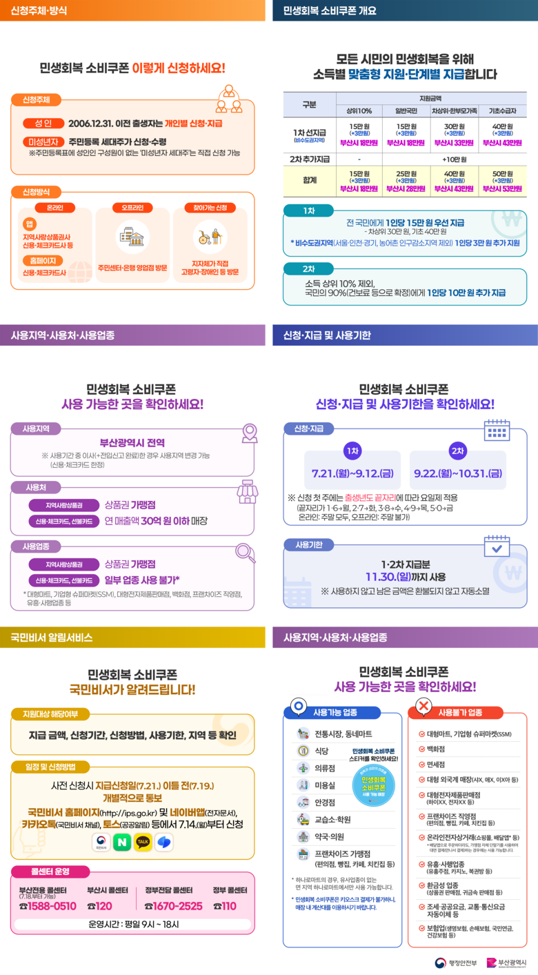 전담 콜센터(☎ 1544-0510)를 통해 소비쿠폰 신청 자격, 절차, 사용처 등 전반적인 문의에 신속하고 정확하게 안내받을 수 있으며, 국민콜(☎ 110) 및 정부 전담콜센터(☎1670-2525)와 연계해 체계적인 상담이 가능하다.