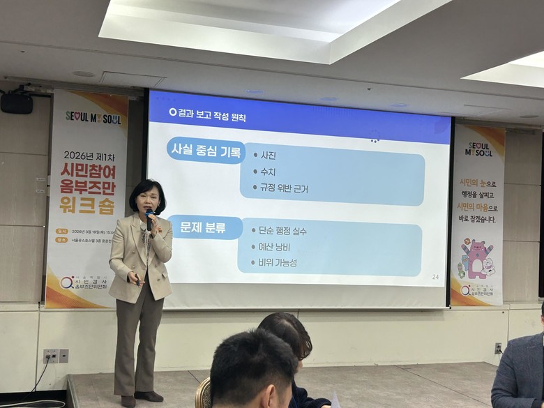 소심향 전 시민감사옴부즈만위원(2026.3.15. 임기만료 퇴임)은 공공사업 감시제도 전반을 이해할 수 있도록 감시절차, 사업종류별 감시방법 등 실무 중심 내용을 강의했다. 특히 감시활동 중 위법.부당한 사례를 어떻게 식별하고 분석할 수 있는지에 대한 구체적인 사례도 제시하였다.