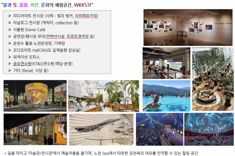 * 5感 시각(미디어아트홀), 청각(사운드아트홀), 후각(식물원카페), 미각(지역특화음식), 촉각(온천 SPA)