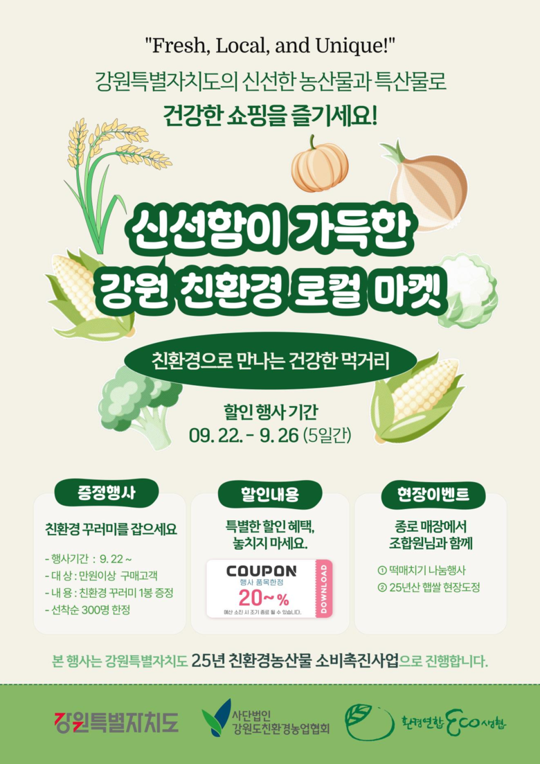 석성균 강원특별자치도 농정국장은 “지난 8월 현대백화점 전국 매장에서 개최한 「강원특별자치도 친환경 로컬마켓 1탄」에 이어, 이번에는 전국 단위 생활협동조합인 두레생협연합과 함께 전국 동시 행사를 개최하게 되어 매우 뜻깊다”며, “많은 소비자에게 강원자치도 친환경 농산물이 알려지고 널리 소비되기를 기대한다”고 밝혔다.