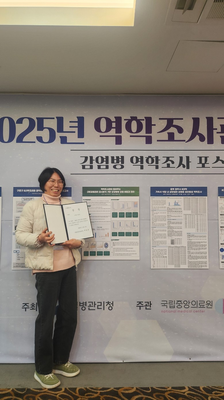 먼저 11월 4일 서울코리아나호텔에서 열린 ‘2025 역학조사관 학술대회’에서 CRE(카바페넴 내성 장내세균목) 감염증 증가의 원인을 다각도로 분석하고, 예방 대책을 제시해 장려상을 받았다.