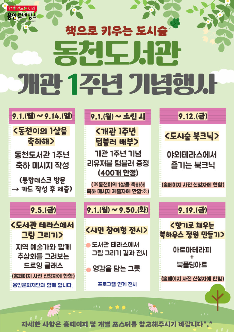 - 9월 독서의 달과 개관 1주년 맞아 시민 참여형 북큐레이션‧전시 등 진행 - [용인시 세계타임즈=송민수 기자] 용인특례시(시장 이상일) 동천도서관은 ‘독서의 달’(9월)과 도서관 개관 1주년을 기념해 9월 한 달간 다양한 행사를 개최한다.