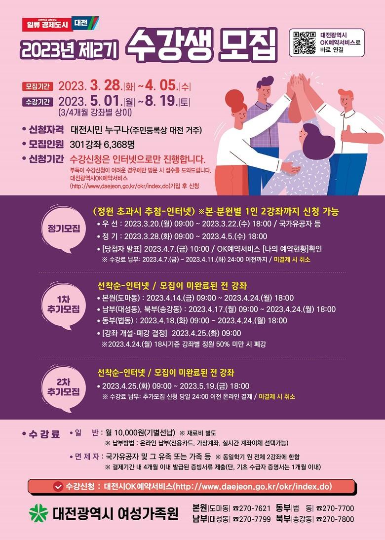 [대전 세계타임즈=이채봉 기자] 대전여성가족원은 오는 3월 28일(화) 9시부터 4월 5일(수) 18시까지 9일간 2023년 제2기 강좌 수강생 6,368명을 모집한다고 밝혔다.