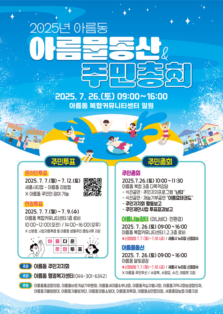 윤석훈 아름동주민자치회장은 “주민총회는 주민 스스로 발굴한 마을의제를 주민과 함께 결정하는 참여와 공론의 장”이라며 “올해에는 주민들이 즐길 수 있는 공연과 행사를 함께 진행하는 만큼 많은 관심과 참여를 부탁드린다”라고 말했다.