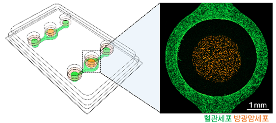 연구팀은 이를 활용해 항암제 내성을 가진 암세포와 기존 암세포에 대한 항암제 효능을 분석했고, 그 결과 혈관이 항암제를 전달하는 첫 매개체로 항암제 효능을 악화시킨다는 것을 발견했다. 그동안 혈관세포는 항암제 효능을 낮추는 요인으로 주목받지 못했지만 새로운 생체칩을 이용해 항암제가 혈관을 통해 암세포로 전달되는 과정을 분석한 결과, 혈관세포가 암 조직에 도달해야 하는 항암제의 양을 감소시키고, 특히 항암제 내성을 가진 암조직에서는 혈관세포가 더욱 항암제 효능을 떨어뜨리는 것으로 확인했다.