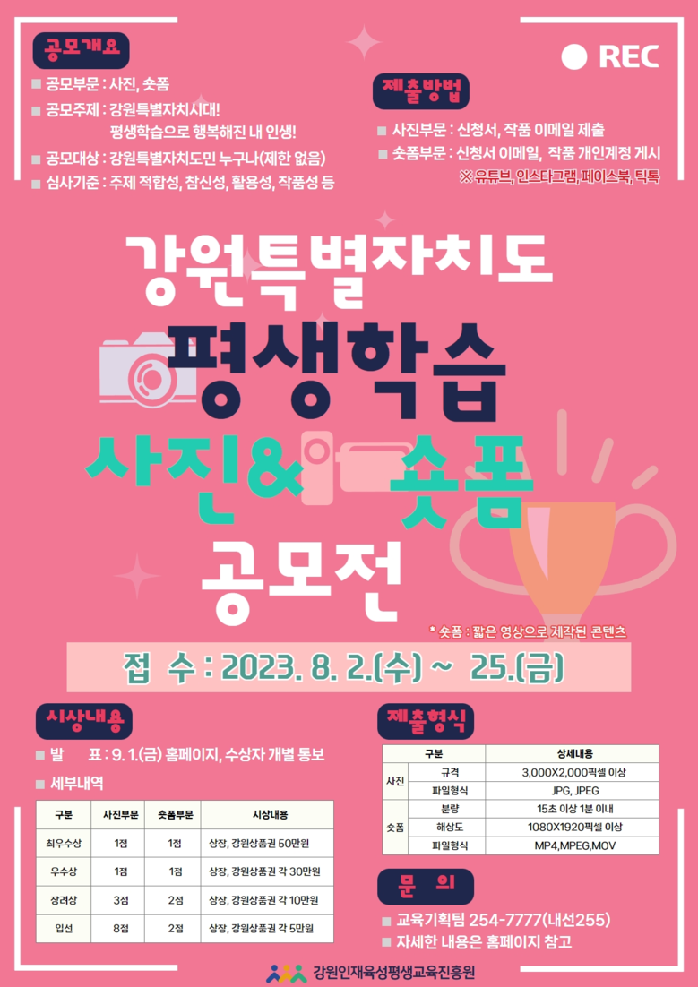 인평원은 올해부터 뉴 미디어 트렌드인 ‘숏폼’ 부문을 추가하여 「강원특별자치시대! 평생학습으로 행복해진 내 인생!」을 주제로 평생교육 프로그램 및 연수, 축제 등 다양한 현장에 참여하여 인생의 새로운 즐거움과 행복을 경험한 사진과 영상을 모집한다.