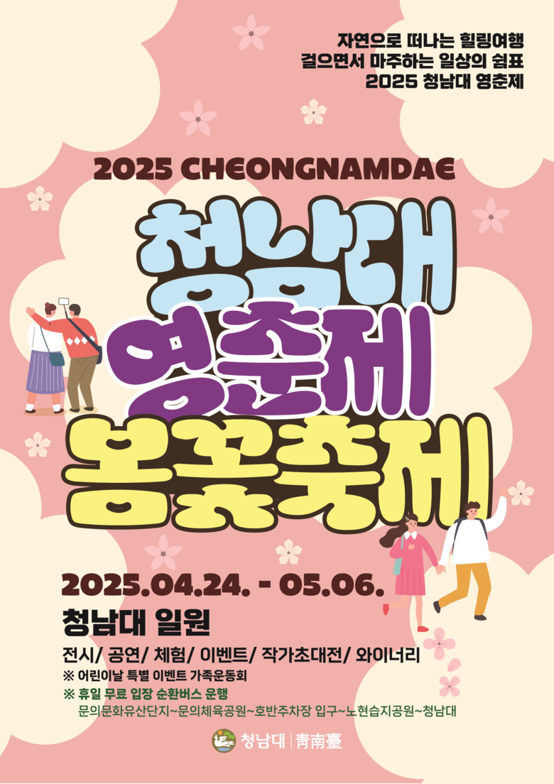대표 행사로는 청남대 영춘제 봄꽃축제가 오는 5월 6일까지 청남대 일원에서 열린다. 이번 축제에서는 봄꽃 전시와 함께 공연, 체험 프로그램 등 풍성한 즐길거리가 마련돼 방문객의 오감을 만족시킬 예정이다.