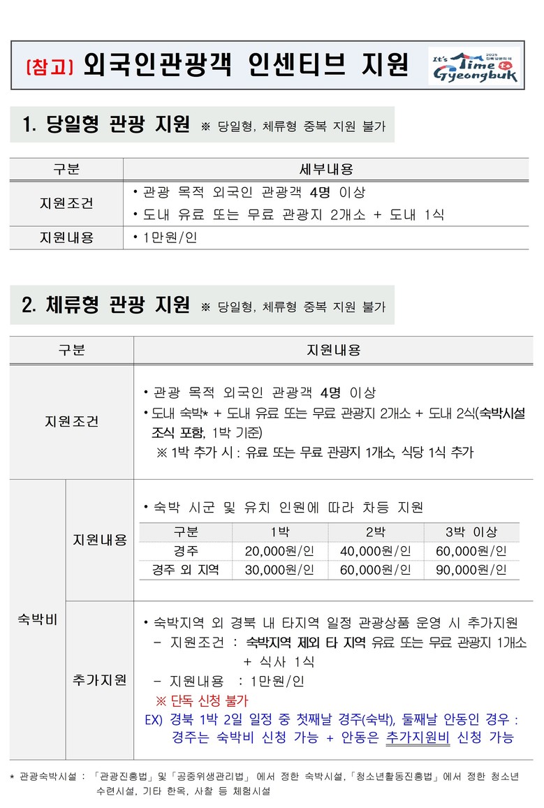 인센티브 지원 세부 사항과 제출 서류는 경상북도문화관광공사 홈페이지(https://www.gtc.co.kr/) 공고문에서 확인할 수 있다.