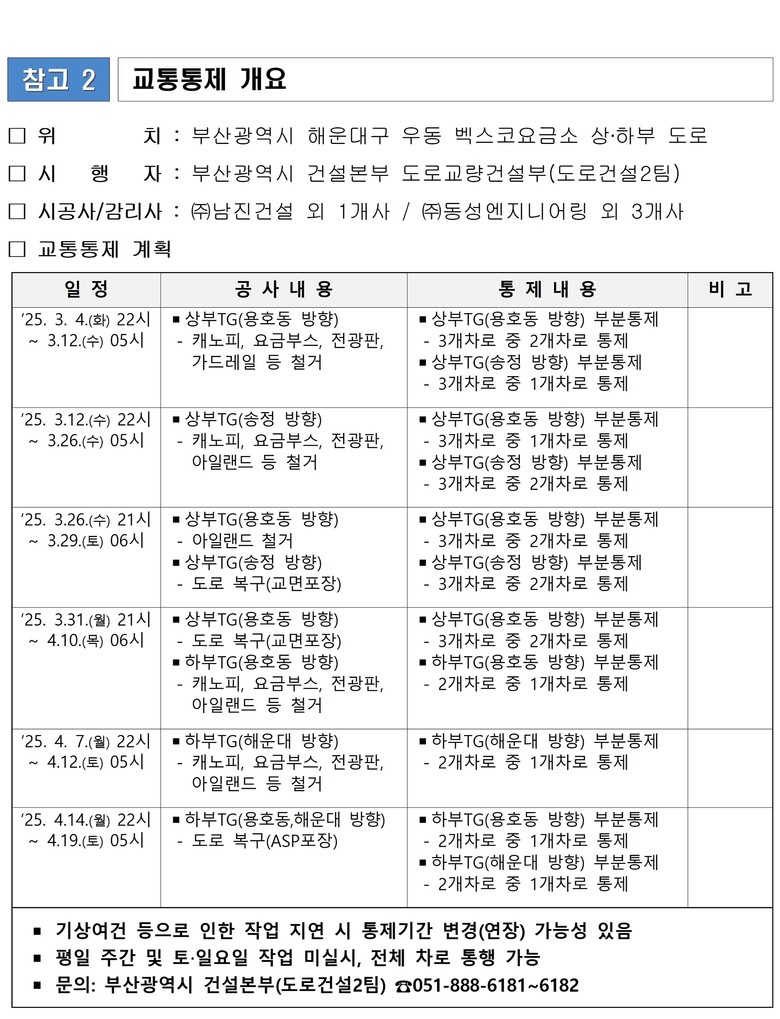 원활한 철거작업과 작업자 및 통행 차량 안전 확보를 위해 ▲상부 요금소 2곳(용호동 방향, 송정 방향)은 각 3개 차로 중 2개 차로 통제, 1개 차로를 개방하며, ▲하부요금소 2곳(용호동 방향, 해운대 방향)은 각 2개 차로 중 1개 차로 통제, 1개 차로를 개방한다.