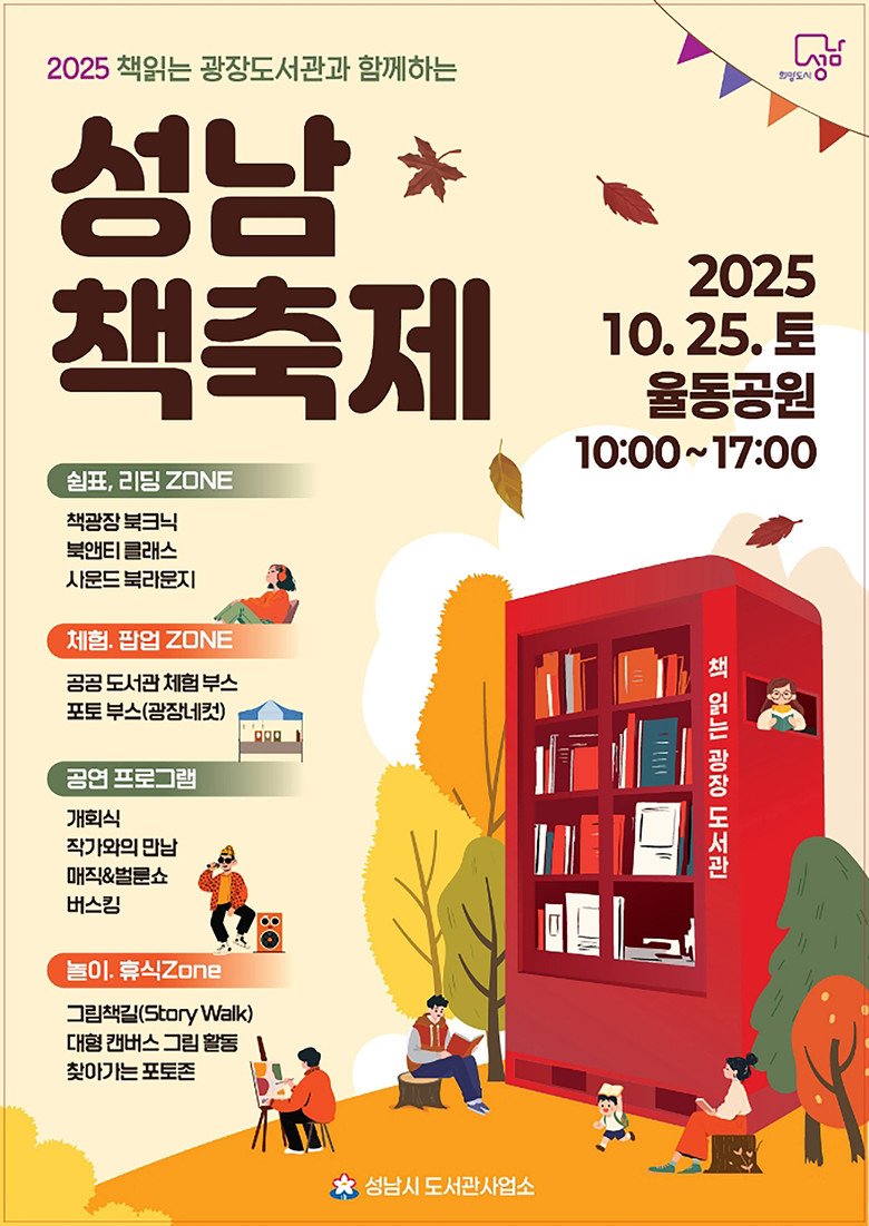 책 읽는 광장 도서관 홍보, 작가와의 만남 등 행사 다양 [성남시 세계타임즈=송민수 기자] 성남시(시장 신상진)는 오는 10월 25일 오전 10시~오후 5시 분당 율동공원 내 잔디광장에서 ‘2025 성남 책 축제’를 연다.