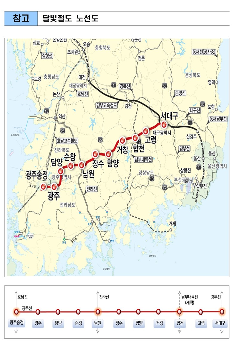 한편, ‘달빛철도’는 광주와 대구를 잇는 총연장 198.8km의 동서횡단철도로 광주에서 출발해 전남(담양)~전북(순창.남원.장수)~경남(함양.거창.합천)~경북(고령)~대구까지 6개 시도와 10개 시군구를 경유한다.