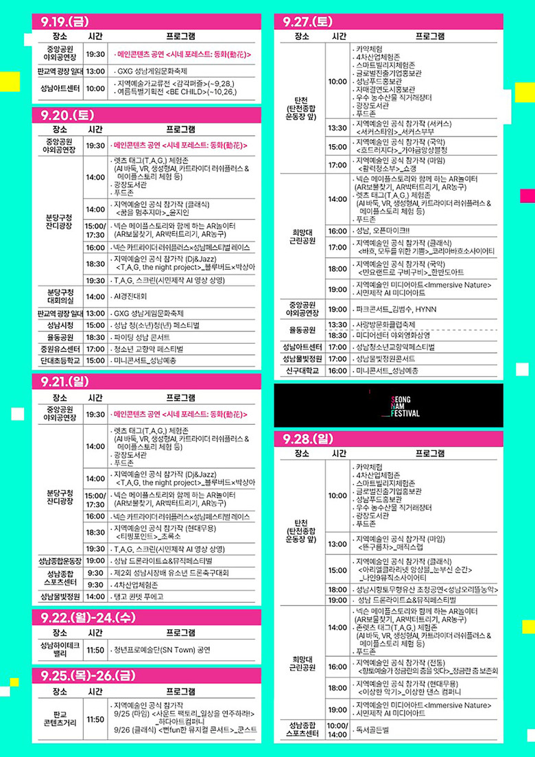 축제는 분당중앙공원을 시작으로 판교, 분당구청 잔디광장, 희망대근린공원 등 성남 전역으로 이어진다. 9월 19일과 20일 판교역 광장에서는 성남게임문화축제 ‘GXG 2025’가 ‘게임, 문화로 즐기다!’를 주제로 열린다. 가수 에일리의 축하공연, 게임음악 경연대회 본선, 해외 게임사 체험 부스, 만화·애니메이션 행사, 성남청년 플리마켓 등이 어우러져 판교 일대를 게임과 문화의 중심지로 만든다.