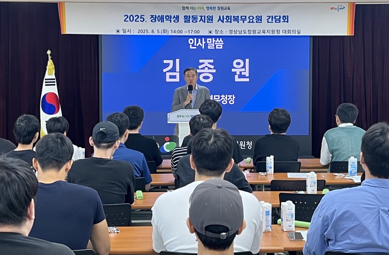 [세계타임즈]최성룡기자 = 경남지방병무청장(김종원)은 5일 경상남도창원교육지원청을 방문하여 교육장과 환담하고, 관내 학교에서 장애학생 활동지원 임무를 수행하고 있는 39명의 사회복무요원들을 격려하는 시간을 가졌다.