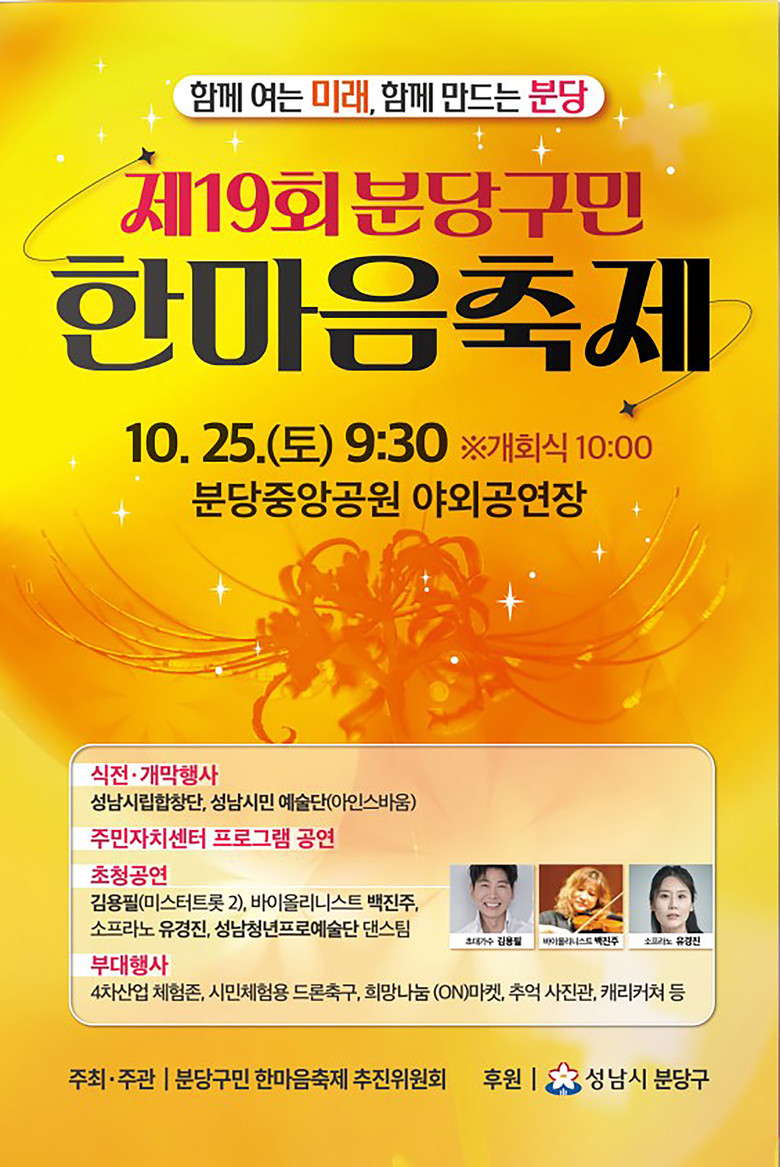 성남시(시장 신상진) 분당구가 후원하고 분당구민 한마음 축제 추진위원회(위원장 김성민)가 주최해 열리는 이번 행사는 지역사회 화합 분위기를 조성하고자 ‘함께 여는 미래, 함께 만드는 분당’을 주제로 진행된다.