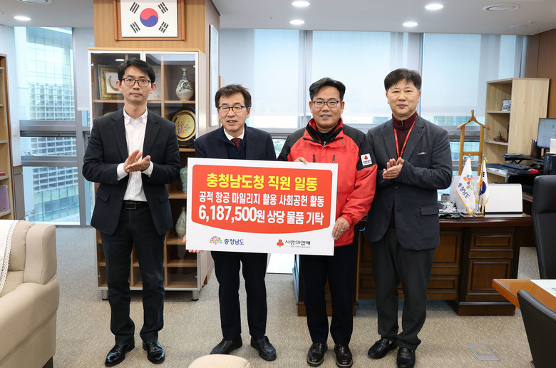 [충남 세계타임즈=이현진 기자] 충남도가 공적 항공마일리지를 활용해 마련한 생활용품을 충남사회복지공동모금회에 기탁하고 따뜻한 지역사회 만들기에 동참했다.