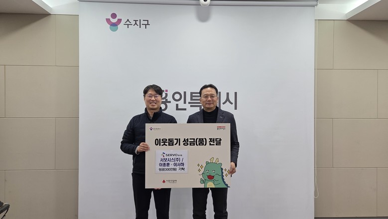 수지구는 동천동에 위치한 사출기 절전 개조 전문 업체인 ㈜서보시스(대표 이종훈)는 6일 이웃돕기 성금 300만원을 수지구에 기탁했다. ㈜서보시스는 2019년부터 매년 사랑의 열차 이어달리기에 동참하는 등 꾸준한 나눔을 실천하고 있다. 올해는 ㈜서보시스 명의로 200만 원, 이종훈 대표 본인과 자녀의 이름으로 100만 원을 기탁했다. 이 대표는 “작년에는 전기 에너지 절감에 이바지한 성과를 인정받아 자동차 부품산업 ESG, 탄소중립 박람회 등에 참가했다”며 “사업 성과를 인정받고, 그 성과를 사회에 환원할 수 있어 기쁘다”고 했다.