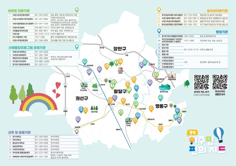 수원시 관계자는 “이주민 편의 지도는 정보 접근에 어려움을 겪는 이주민들에게 실질적인 도움을 줄 수 있는 자료”라며 “이주민의 정착과 생활에 필요한 다양한 정보를 지속해서 발굴하고 제공하겠다”고 밝혔다.