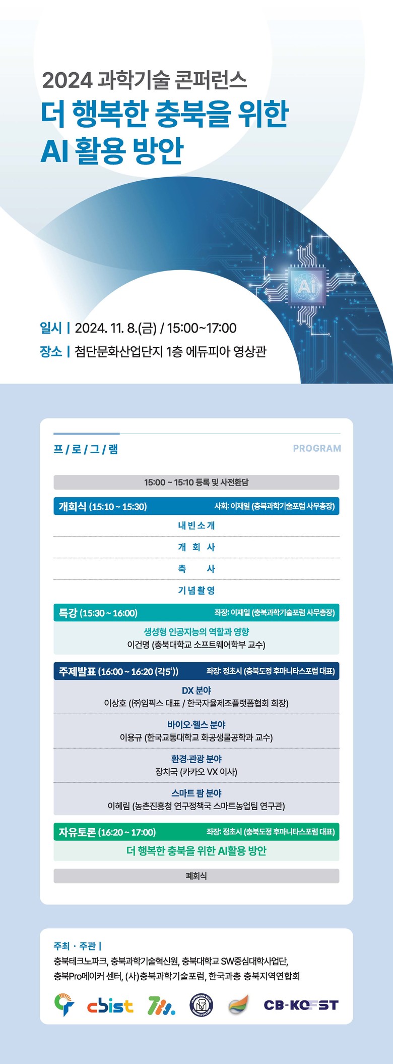 충북 디지털 위크 기간 중 열린 이번 행사는 (사)충북과학기술포럼, 한국과총 충북지역연합회, 충북Pro메이커센터, 충북대 SW중심대학사업단, 충북TP, 충북과기원이 공동 주관했으며, 지역혁신기관, 대학, 기업 등 다양한 분야 관계자들이 참석하여 AI 기술을 통한 충북의 발전과 행복 증진을 위한 방안을 논의했다.