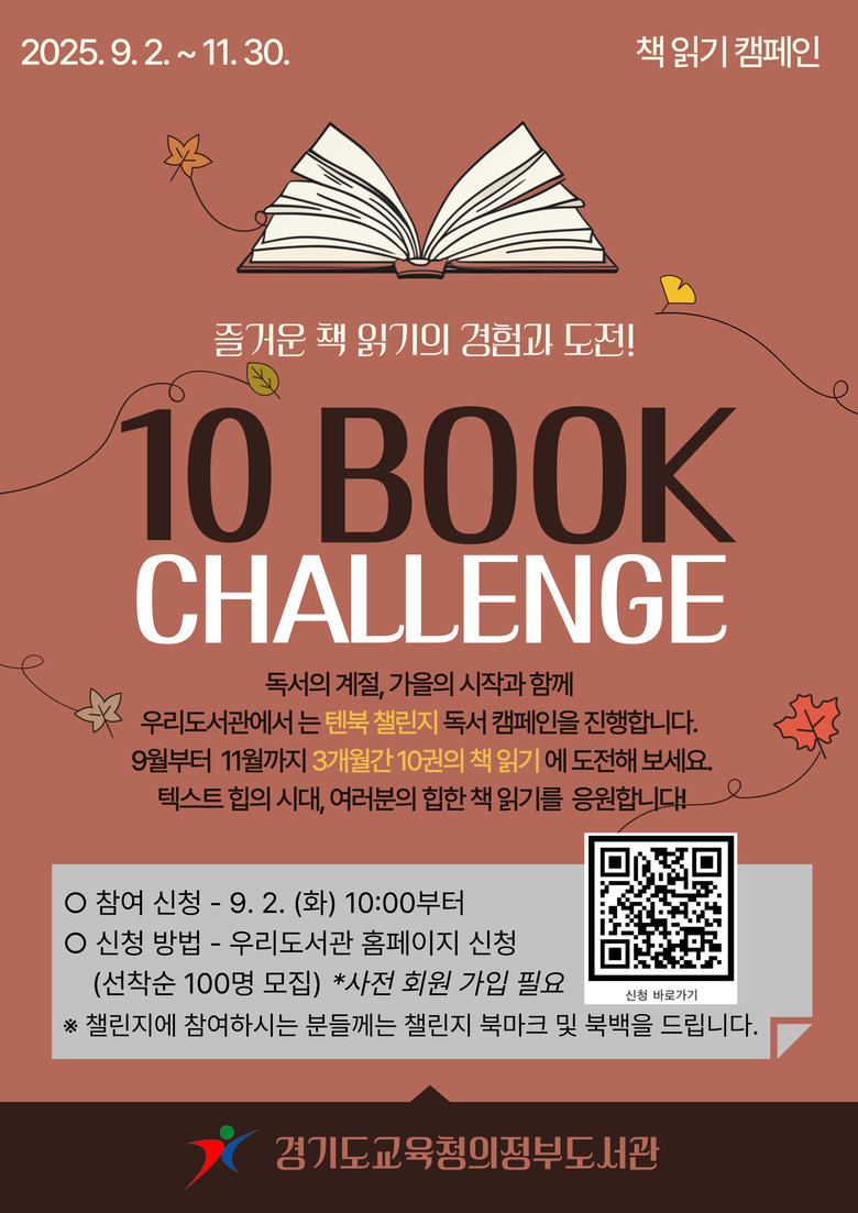 9월부터 11월까지 운영되는 이번 캠페인은 3개월간 10권의 책 읽기 도전을 통해 청소년 및 성인의 독서율을 높이고 참가자들에게 독서의 즐거움을 주고자 마련됐다.