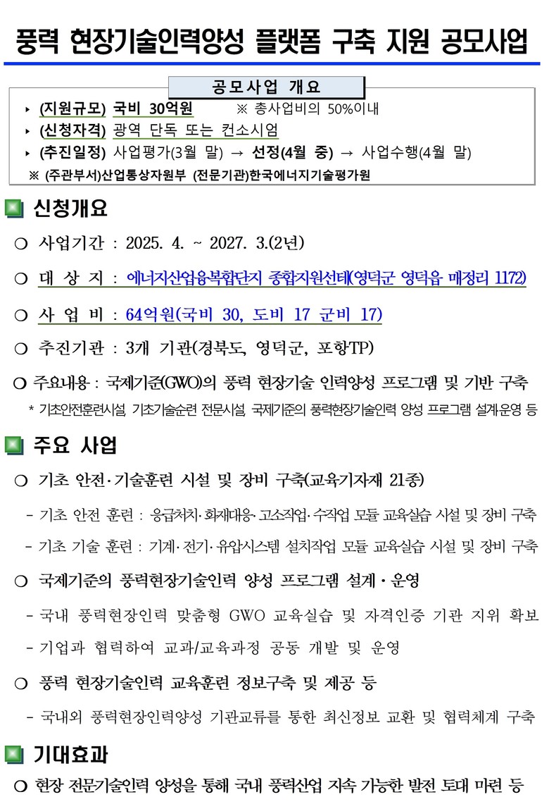 - 기초안전교육(BST)·기초기술교육(BTT) 기자개 21종 및 교육 프로그램 개발 구축 - [경북 세계타임즈=한윤석 기자] 경북도는 28일 산업통상자원부가 주관하고 한국에너지기술평가원에서 전담하는 ‘풍력 현장 기술 인력양성 플랫폼 구축’ 공모사업에 최종 선정되어 총사업비 64억원(국비 30억, 도비 17억, 군비 17억)을 확보했다.
