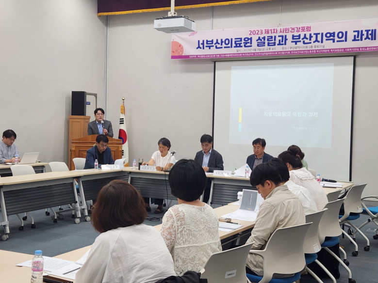 이번 포럼은 서부산의료원 설립 진행사항을 점검하고 부산 의료안전망 구축을 위한 부산지역의 과제를 논의하기 위해 ‘건강사회를 위한 치과의사회 부산경남지부, 인도주의 실천을 위한 의사회 부산울산지회, 전국보건의료산업노동조합 부산지역본부, 복지포럼공감, 사회복지연대, 한국노동안전보건연구소’와 함께 공동주최하여 개최했다.