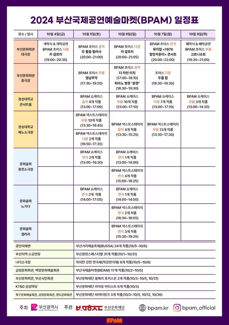 특히, 올해 비팜(BPAM)은 누구나 즐기는 지속 가능한 축제형 마켓을 목표로 작품공연, 공연산업관계자 간 미팅, 세미나, 시민참여 행사 등 지난해보다 더 새롭고 다채로운 콘텐츠를 선보인다.