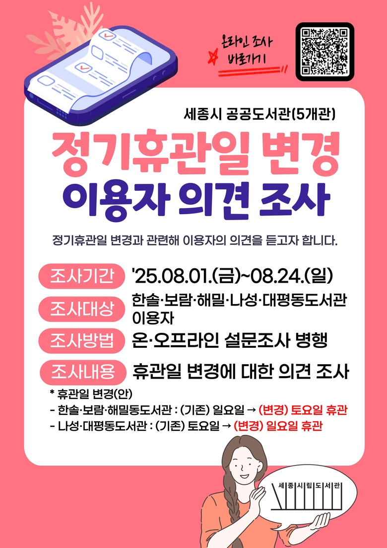 세종시립도서관 관계자는 “이번 조사는 인근 도서관 휴관일 중복으로 인한 이용 불편을 해소하기 위한 절차”라며 “많은 시민들이 참여하셔서 합리적인 휴관일 조정이 이뤄지길 바란다”고 말했다.