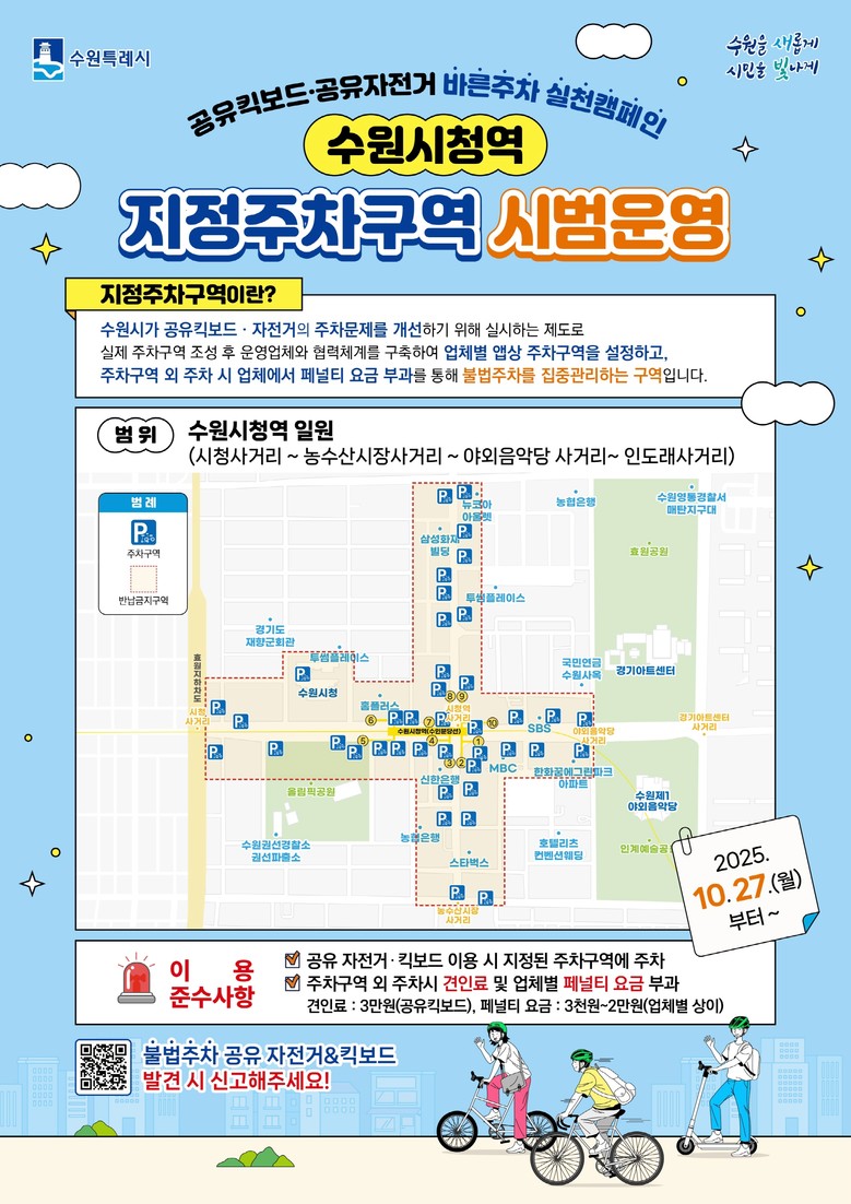 수원시 관계자는 “무분별한 공유 자전거와 킥보드 주차가 보행자의 안전을 위협하고 도시 미관을 해쳐왔다”며 “이번 지정주차구역 시범 운영으로 질서 있는 공유 모빌리티 문화가 정착되길 바란다”고 밝혔다.