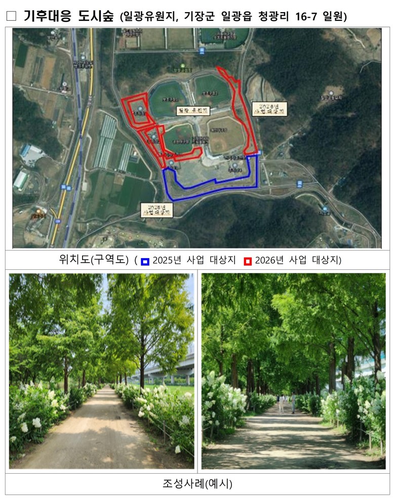▲대연수목전시원 일원 평화기원의 숲(3.8ha)과 ▲정관신도시 정관중앙로 일원(1ha)에 ‘도시와 연결숲’을 조성한다.
